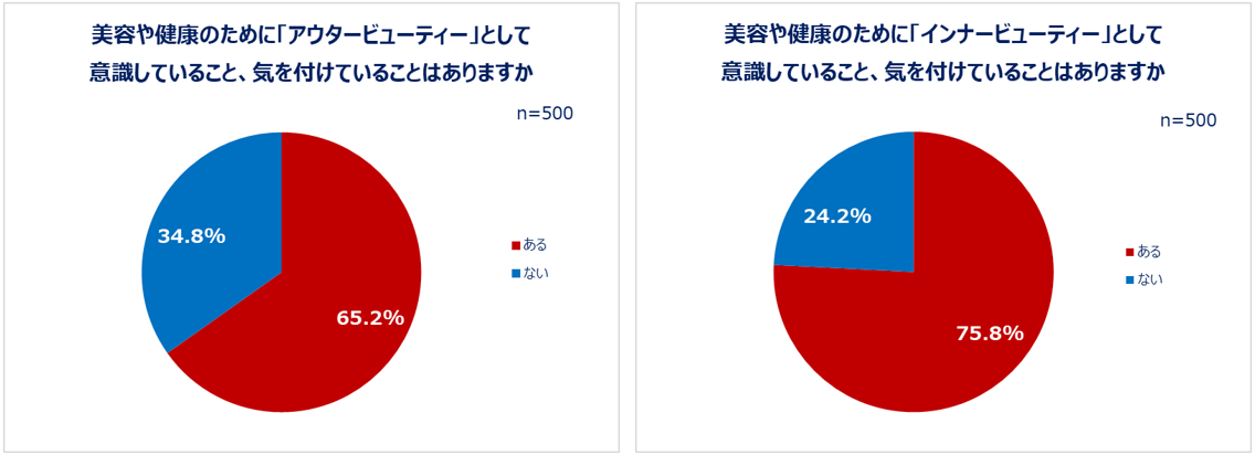 まずは、美容や健康のためにアウタービューティーとインナービューティー、それぞれどれくらい意識しているかを聞きました。その結果、アウタービューティーにおいては65.2%、インナービューティーにおいては75.8%の人が、意識している・気を付けていることがあると回答しました。