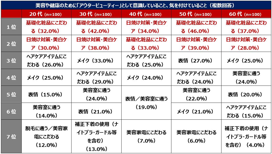 2.アウタービューティーは世代問わず「基礎化粧品にこだわる」「日焼け対策・美白ケア」が上位に