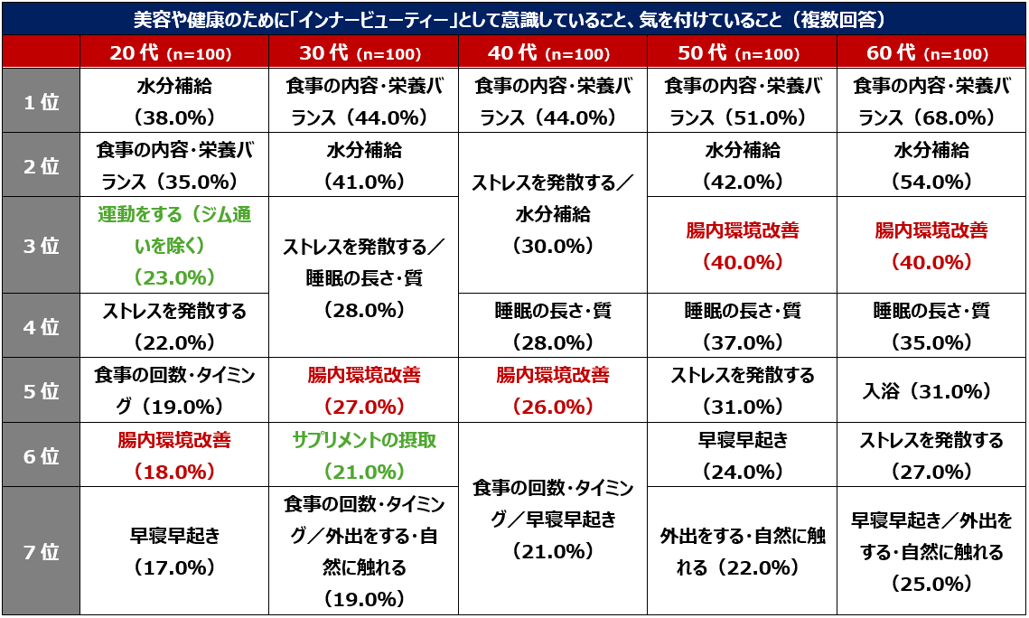 実践している人がより多かったインナービューティー。20代においての1位は「水分補給(38.0%)」、60代においての1位は「食事の内容・栄養バランス(68.0%)」でした。20代では「運動をする(ジム通いを除く)(23.0%)」、30代では「サプリメントの摂取(21.0%)」が他の世代と比べて上位にランクイン。「腸内環境改善」は、年齢層が上がるほどランキングも上がるという傾向が見えました。