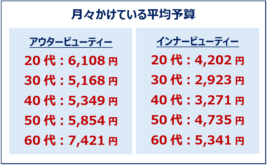 アウタービューティーとインナービューティーそれぞれに月々かけている金額を聞いたところ、平均金額はどの年齢層でも1,000円~2,200円ほどアウタービューティーの方が高い結果となりました。インナービューティーは、栄養バランスや生活習慣など、お金をかけずに意識できることも多い中でも、各世代一定の金額を使っているようです。また、若い世代である20代が、50代・60代に次ぐ平均金額となり、メイクやスキンケアといったアウタービューティーだけでなく、内側から美しくなるインナービューティーにも注目し、ある程度お金をかけていることが分かります。