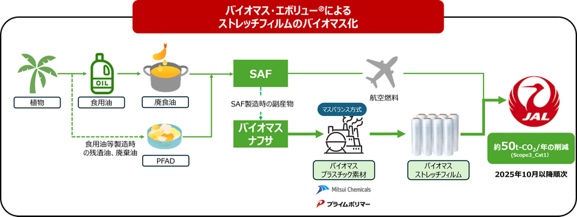 JALではこのバイオマス由来のストレッチフィルムを2025年10月より順次採用を進め、約50t/年のCO2排出量削減に貢献します。(ご参考:JALのプレスリリース https://press.jal.co.jp/ja/release/202509/009058.html )