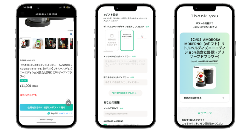 そこでこの度、お客様にもっと気軽にAMOROSA MODERNOの商品をプレゼントとしてご利用いただきたいという思いから、AnyGiftの導入を決定いたしました。