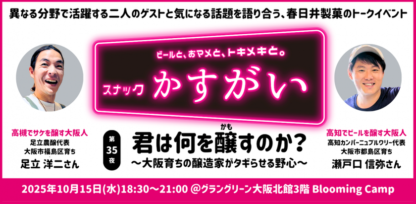 「スナックかすがい」は、春日井製菓が毎回テーマの異なるゲストを招いてトークを展開する人気イベントで、今回もグリーン豆やクラフトビールを楽しみながら、業界・地域を盛り上げる取り組みについて語り合います。