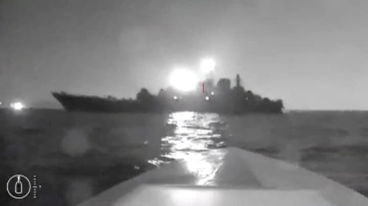 黒海沿岸のノボロシースク港の近くでロシアの軍艦に向かっていくウクライナの無人艇(8月4日) Video obtained by Reuters/via REUTERS