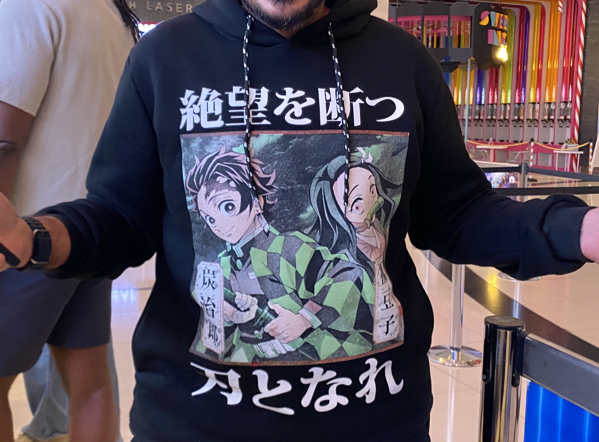 コスプレをしたファンの姿もあった。私が見かけた範囲では、全身、小物類までしっかり作り込んだコスプレは炭治郎3名、禰豆子2名、胡蝶1名、冨岡1名。羽織柄の服を着た人は、善逸3名。キャラやロゴがプリントされた洋服を着た人は数えきれなかった。