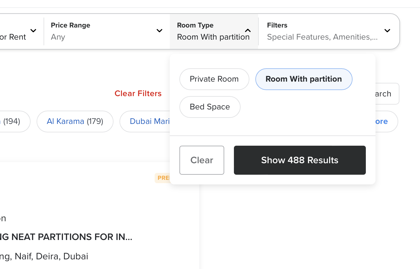 この「パーティション」は、小売、サービス、ロースキルの事務方など、ドバイの低所得者層の間では一般的な居住形態で、ブルーカラー労働者たちの「ベッドスペース(三段ベッドの一床が個人スペース)」よりはワンランク上の居住形態と言える。
